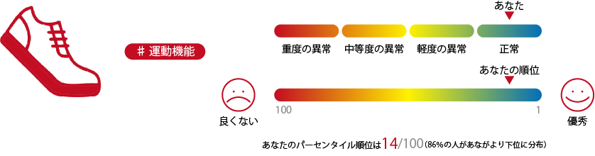 エピジェネティクスの情報から推測した総合的な運動機能の評価結果です。年齢を重ねても体力や運動能力を維持している人は、様々な病気のリスクが低く、健康寿命が長くなる傾向があります。