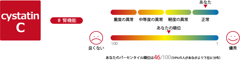 エピジェネティクスの情報から推測した血液中のシスタチンCの値の評価結果です。シスタチンCは特定の酸素の働きを抑える物質で、腎臓の働きを調べるときに重要な役割を持っているため、シスタチンCが高い場合には、腎機能の低下により、慢性腎臓病や腎不全のリスクが高まっている可能性があります。