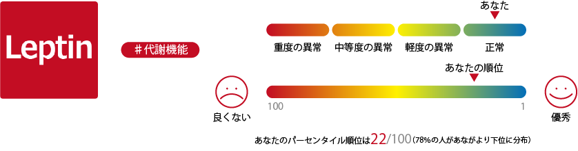 エピジェネティクスの情報から推測した血液中のレプチンの値の評価結果です。レプチンは、主に脂肪細胞から作られるホルモンで、エネルギーのバランスをとったり、食欲を抑えたり、体重をコントロールするのに大事な役割を持っているため、レプチンが高い場合には、代謝機能の低下や、2型糖尿病のリスクが高まっている可能性があります。