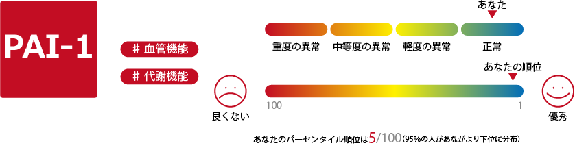 エピジェネティクスの情報から推測した血液中のプラスミノーゲン活性化抑止因子-1(PAI-1)の値の評価結果です。PAI-1は、血液が固まることや、固まった血液が溶けることを調整するタンパク質で主に心臓や血管の病気、血栓(血のかたまり)ができるリスク、代謝機能に関わっています。PAI-1が高い場合には、心筋梗塞・脳卒中・動脈硬化症・2型糖尿病などのリスクが高まっている可能性があります。