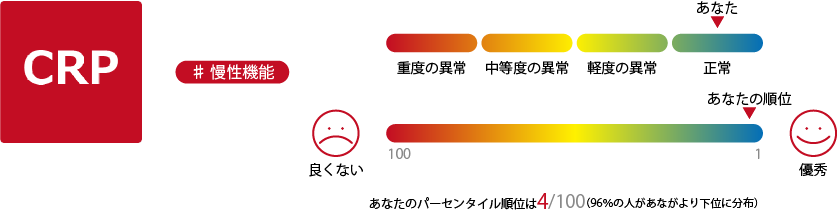 エピジェネティクスの情報から推測した血液中のC反応性タンパク質(CRP)の値の評価結果です。CRPは、体の中で炎症が起きているかどうかを調べるときによく使われるタンパク質です。体の中で長く続く炎症や全身的な炎症のリスクを評価するために使われます。血中CRPが異常な場合には、心血管疾患・関節リウマチ・慢性閉寒性肺疾患・炎症性陽疾患などの可能性があります。