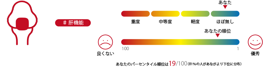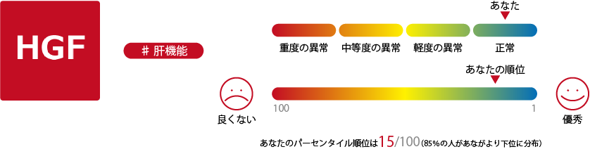 エピジェネティクスの情報から推測した血液中の肝細胞増殖因子(HGF)の値の評価結果です。HGFは、肝臓の細胞の増殖や移動を助けるタンパク質で、腎臓、肺、心臓、神経などの修復や再生にも関係しています。HGFが高い場合には、慢性肝炎、肝硬変、肝臓がんなどのリスクが高まっている可能性があります。