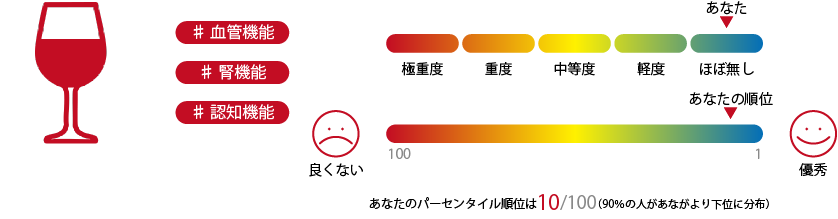 エピジェネティクスの情報から推測したアルコール曝露レベルの評価結果です。エピジェネティクスから推定したアルコール摂取レベルは、自己申告に基づくアルコール摂取レベルよりも信頼性が高いことが研究で報告されています。このレベルが高い場合は、飲酒の影響により老化が加速している可能性が示唆されます。