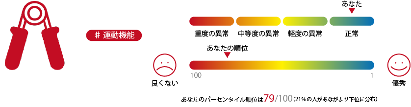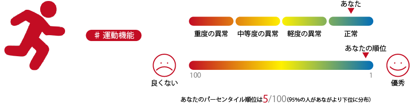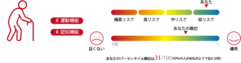 エピジェネティクスの情報から推測した総合的な運動機能の評価結果です。年齢を重ねても体力や運動能力を維持している人は、様々な病気のリスクが低く、健康寿命が長くなる傾向があります。