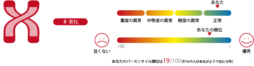 エピジェネティクスの情報から推測した白血球中のテロメア長の評価結果です。テロメアはDNAの両端を保護するキャップのようなもので、細胞が分裂するたびに短くなっていきます。テロメアが短くなると細胞分裂の回数が減り、細胞の老化が進んでいくため、この長さで寿命や加齢性疾患のリスクが推定できると考えられています。
