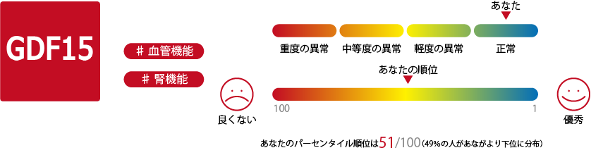 エピジェネティクスの情報から推測した血液中の成長分化因子15(GDF15)の値の評価結果です。GDF15は、細胞の成長を抑えることや、細胞が死ぬことに関わっています。GDF15が高い場合には、心臓や血管の病気、2型糖尿病、慢性腎臓病、いろいろな種類のがんと関係があることが報告されています。
