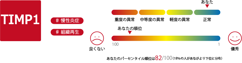 エピジェネティクスから推測した血液中の組織阻害因子メタロプロテイナーゼ1(TIMP1)の値の評価結果です。TIMP1は、身体の組織の作り直しや傷の治り方、腫瘍の成長など、さまざまな体の働きや病気の進行に関係しています。TIMP1の量が異常な場合には、慢性の肝臓病や肺線維症といった長く続く炎症性の病気や、心不全・動脈硬化のリスクが高まっている可能性があります。