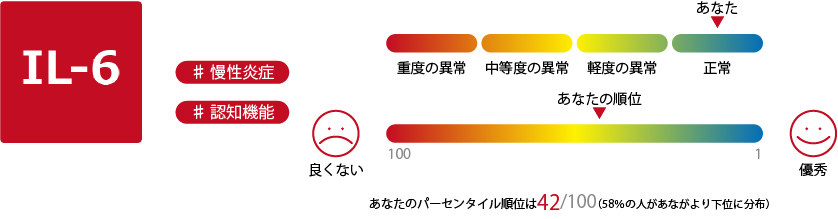 エピジェネティクスの情報から推測した血液中のインターロイキン-6(IL-6)の値の評価結果です。IL-6は、主に体の中で炎症を調整するタンパク質であるため、IL-6が高いと関節リウマチや全身性エリテマトーデス、クローン病といった慢性的な炎症によって起こる病気のリスクが高まっている可能性があるほか、認知機能の低下や、アルツハイマー病のリスクが高まることが示されています。