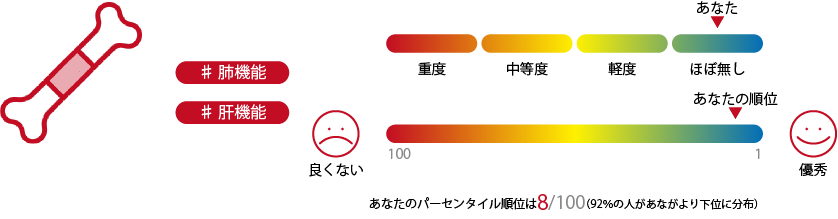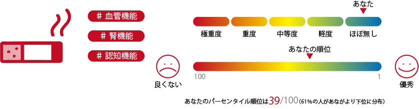 エピジェネティクスの情報から推測した累積的な喫煙曝露レベルの評価結果です。喫煙は老化を加速させることが多くの研究で報告されています。喫煙曝露レベルに異常がある場合には、喫煙や副流煙吸引の影響による老化が進んでいる可能性があります。
